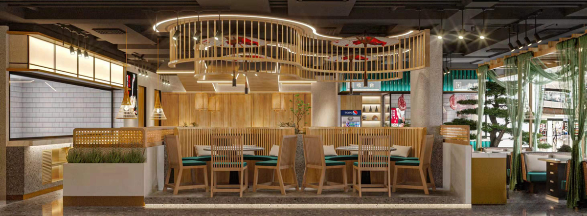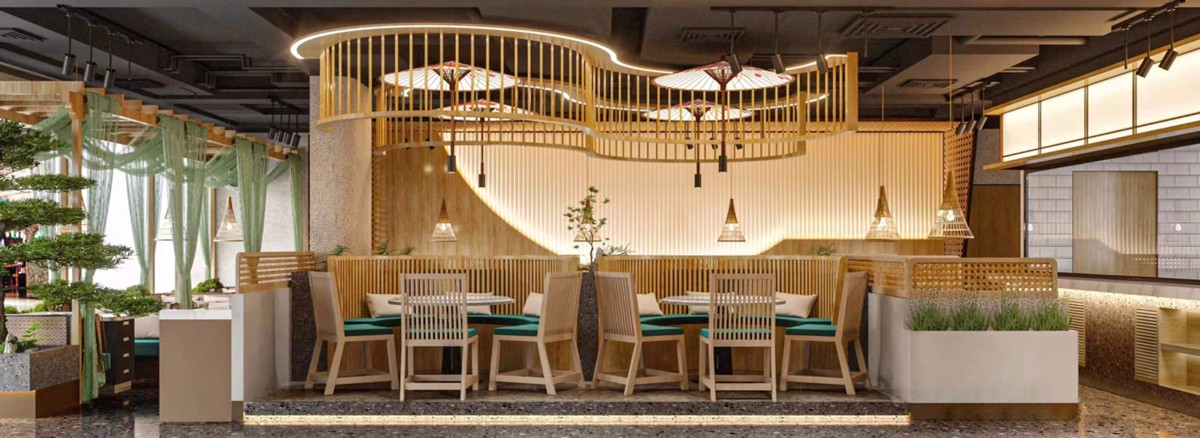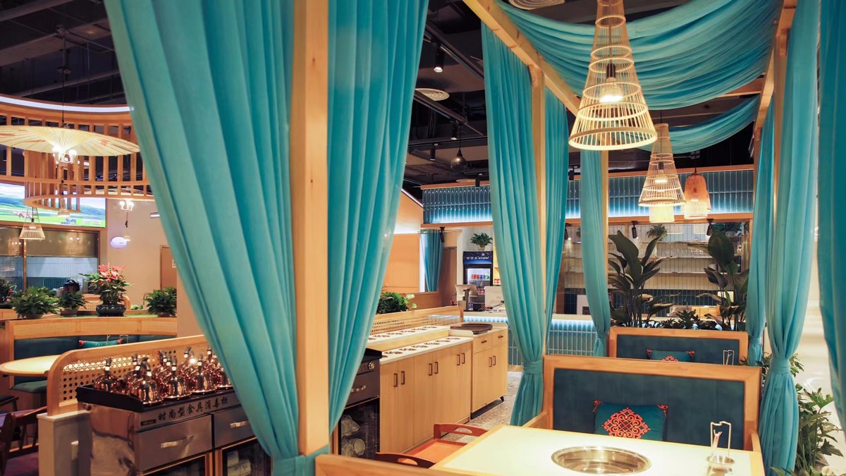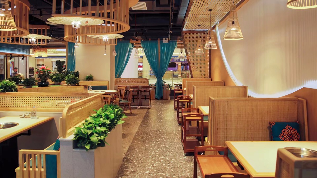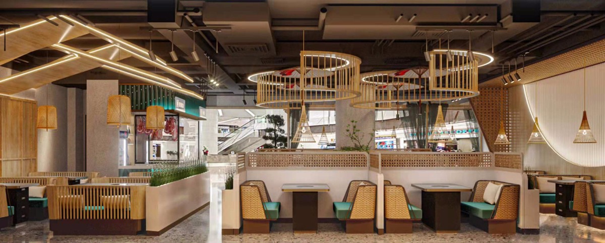 潮牛鮮生大面積采用木制材料及竹編工藝,讓空間呈現(xiàn)親近自然的清新感。竹制靠背椅讓用餐客戶能享受舒適的用餐空間,又能保障用餐的私密性。而孔雀藍(lán)的配飾讓整個(gè)空間添了幾分典雅。