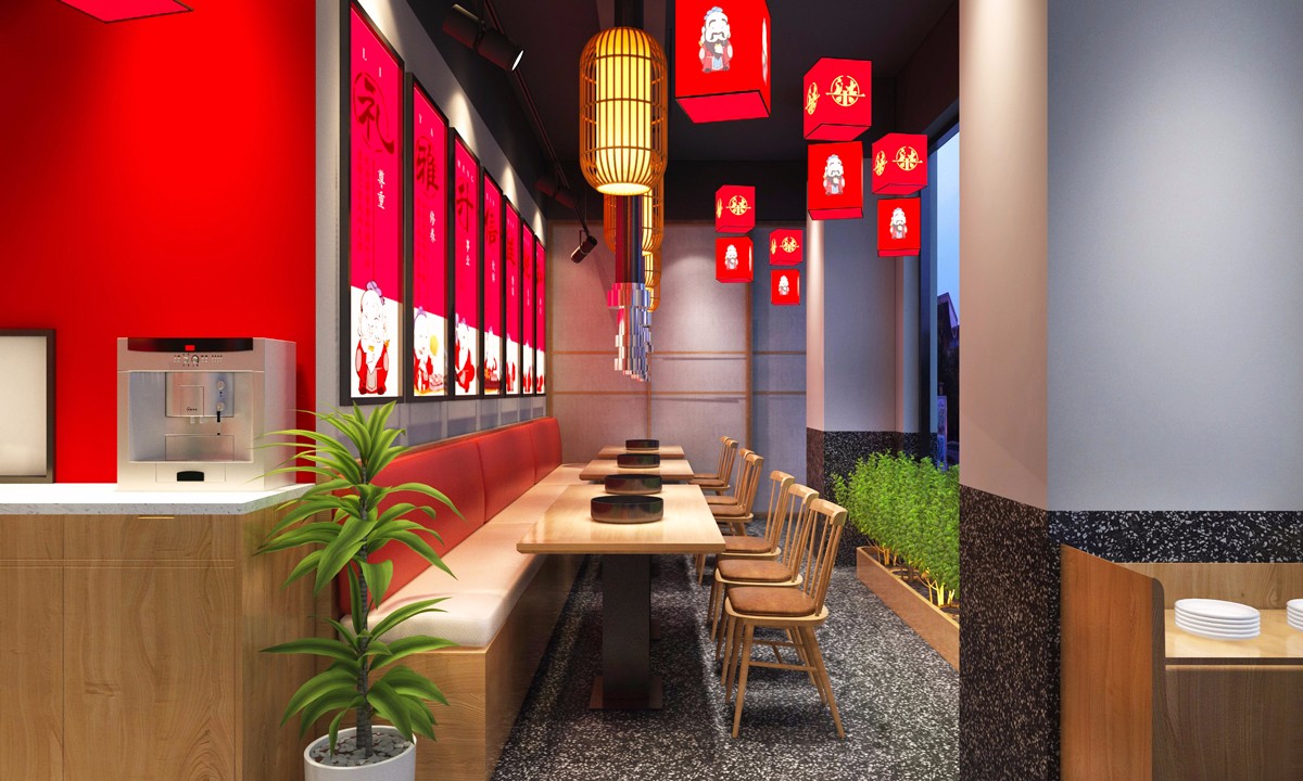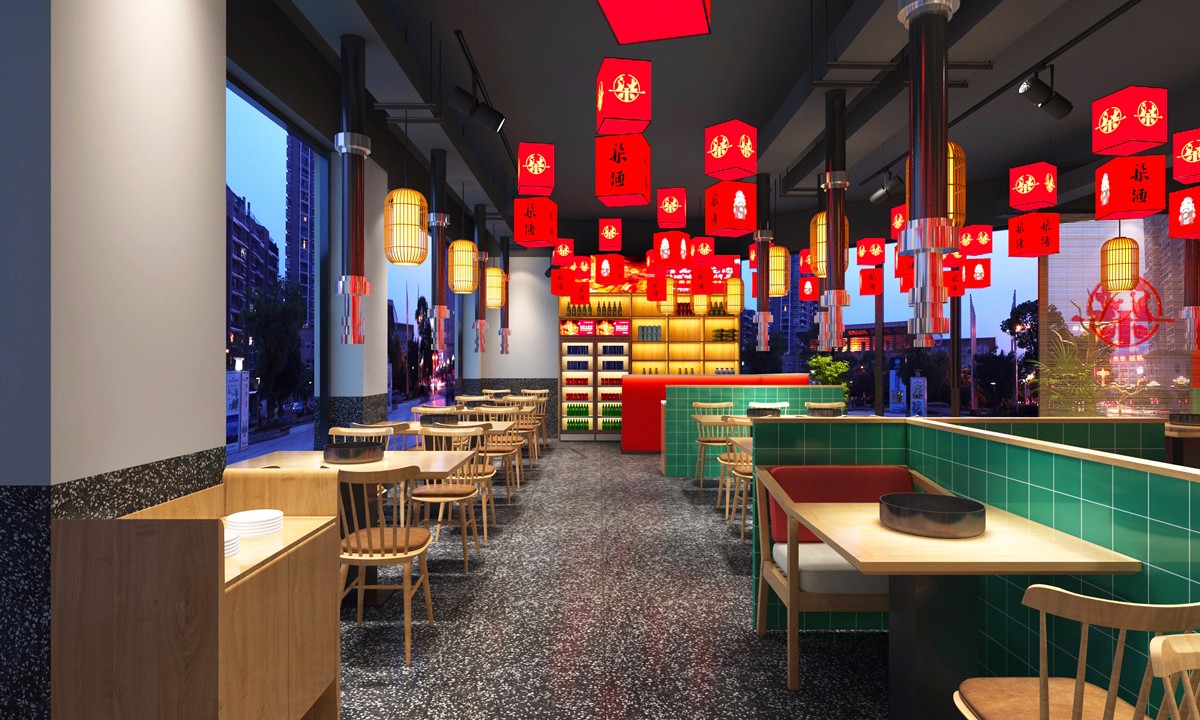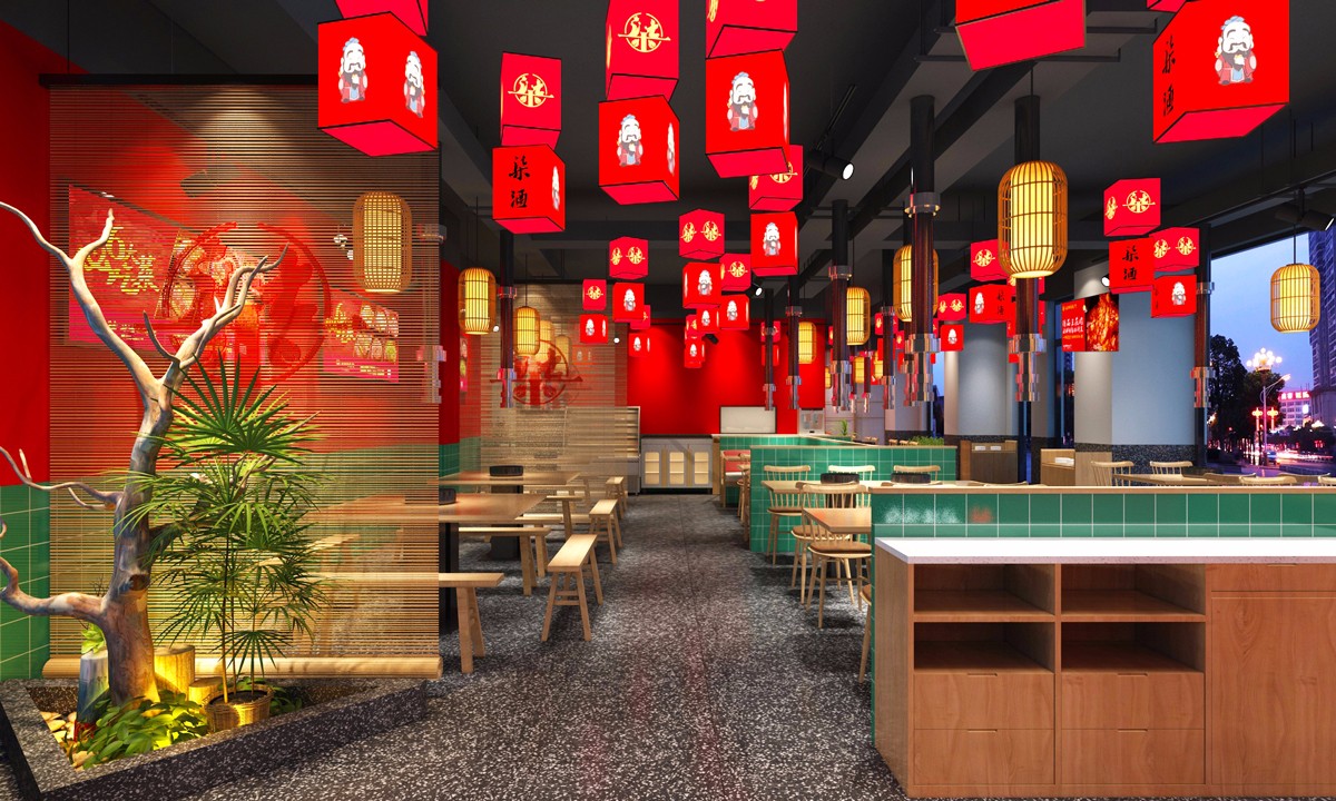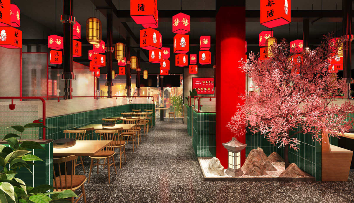 此次設(shè)計創(chuàng)意來源自中國傳統(tǒng)文化,整個空間呈現(xiàn)濃厚的中國風(fēng),大量使用紅燈籠營造氛圍。將中國紅作為主色調(diào),視覺沖擊大,讓人一眼識別。同時在店內(nèi)打造了一塊專屬文化墻,用于宣傳品牌文化。設(shè)計師將柒酒文化與空間設(shè)計完美融合,使柒酒品牌更加豐滿。